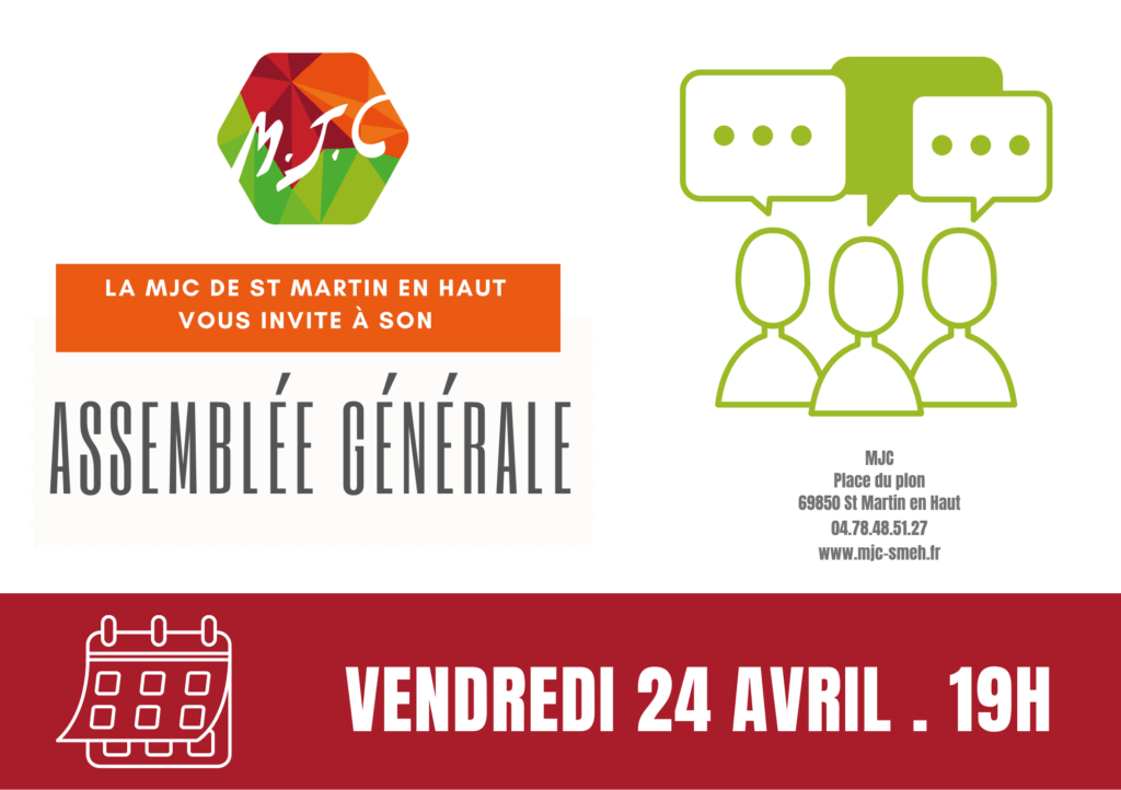 Les bénévoles du Conseil d’Administration de la MJC de Saint-Martin-en-Haut vous invitent à l’Assemblée Généralevendredi 24 avril de 19 h à 21 h à la MJC.