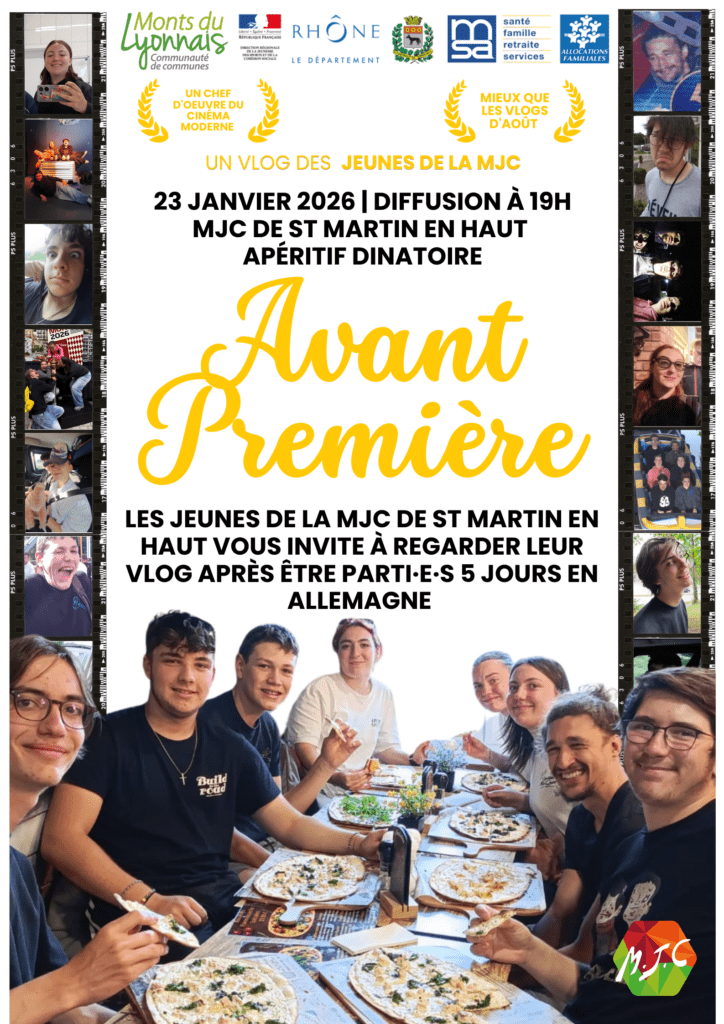 Rendez vous le vendredi 23 janvier 2026 à 19h à la MJC de Saint Martin en Haut pour l’avant première de notre vlog !